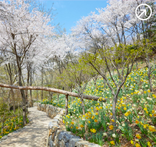 10만 송이 수선화가 만드는 노란 물결! 화담숲에서는 산수유, 복수초, 풍년화 같은 봄 야생화가 숲길을 따라 이어지고, 수선화 군락 사이로 하얀 자작나무가 어우러진 풍경이 기다리고 있어. 4월 초엔 벚꽃까지 더해지니 봄꽃의 모든 것을 한 번에 즐길 수 있지. 테마원을 걸으며 진달래, 개나리, 히어리, 매화까지 구경하거나, 모노레일 타고 숲 전체를 한눈에 담는 방법도 있어!
