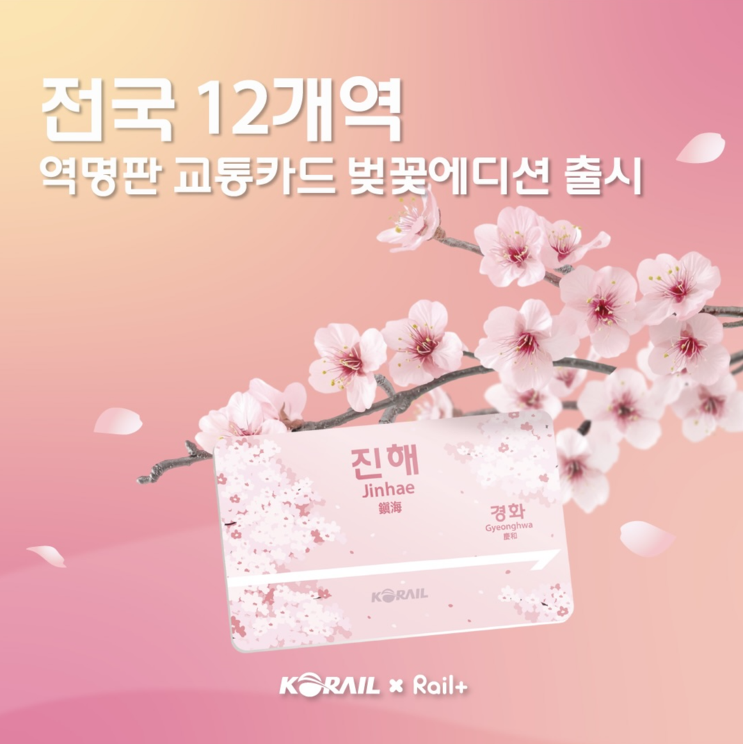 코레일(한국철도공사)이 벚꽃 시즌을 맞아 귀여운 한정판을 들고 왔어. 전국 벚꽃 명소 기차역의 역명판에 벚꽃디자인을 더한 한정판 레일플러스 '역명판 교통카드 벚꽃에디션'을 3월 16일에 출시했대.