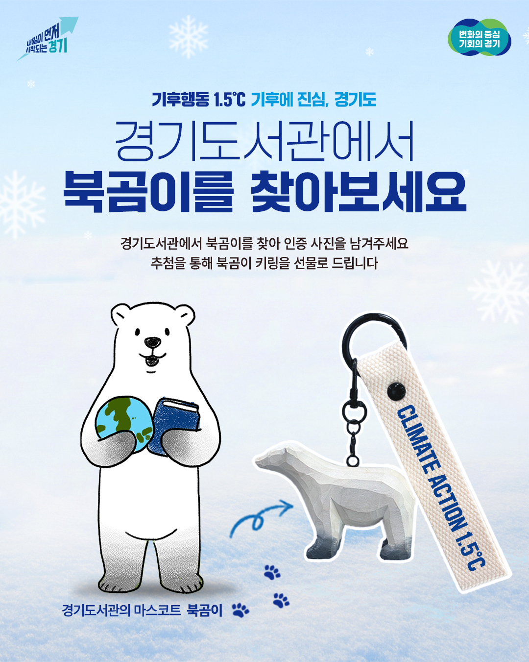경기도서관 로비에서 '북곰이'를 찾아 인증샷 남기면 한정판 북곰이 키링🐻❄을 받을 수 있는 이벤트가 열리고 있어!